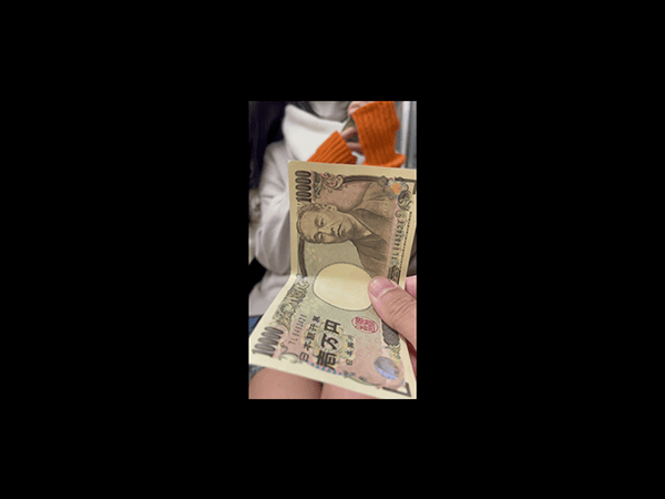目があっち向いてるけど、お手々はしっかりとお札へ